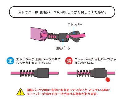 ストッパーを回転パーツ本体の中に完全に入れないと、ストッパーが緩んで回転パーツから抜け出してしまいロープからパーツが外れ紛失する要因になります。